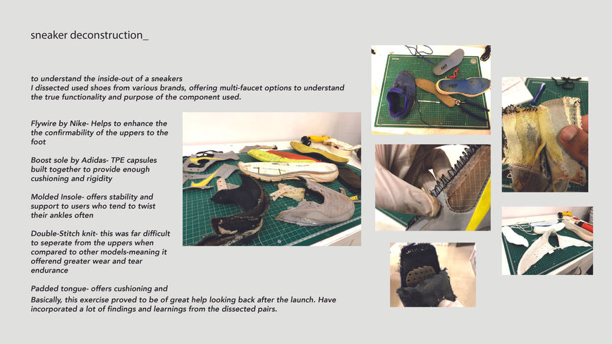 To understand the inside-out of the sneakers, I dissected used shoes from various brands to learn the functionality of each element.